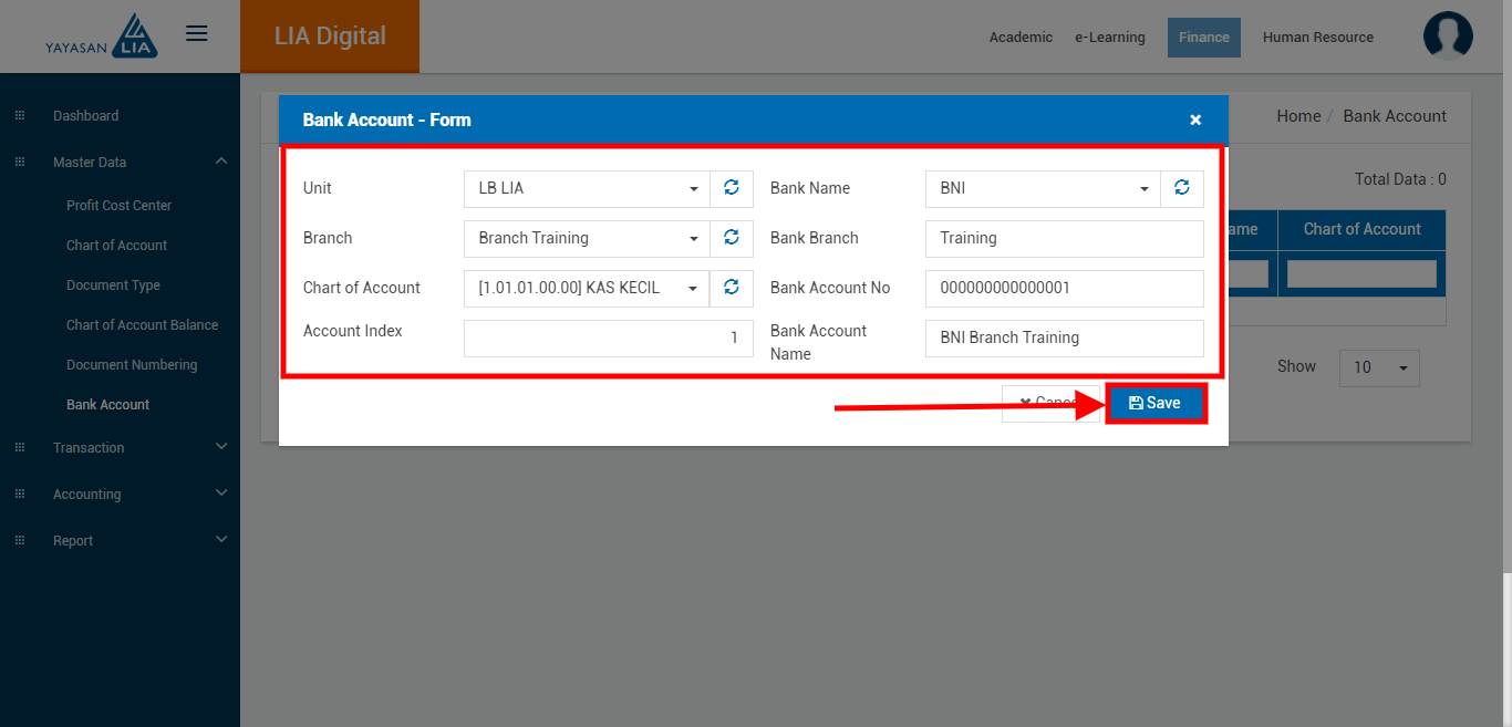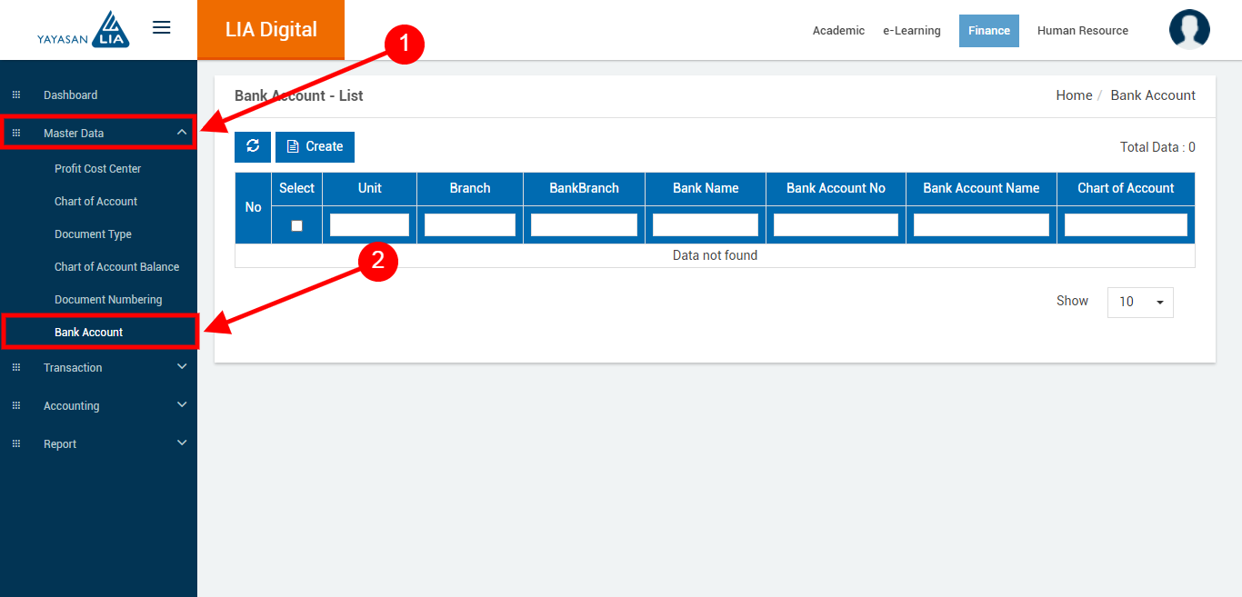 - Klik menu Master Data > Bank Account pada sidebar dibagian kiri, maka akan tampil halaman diatas.
