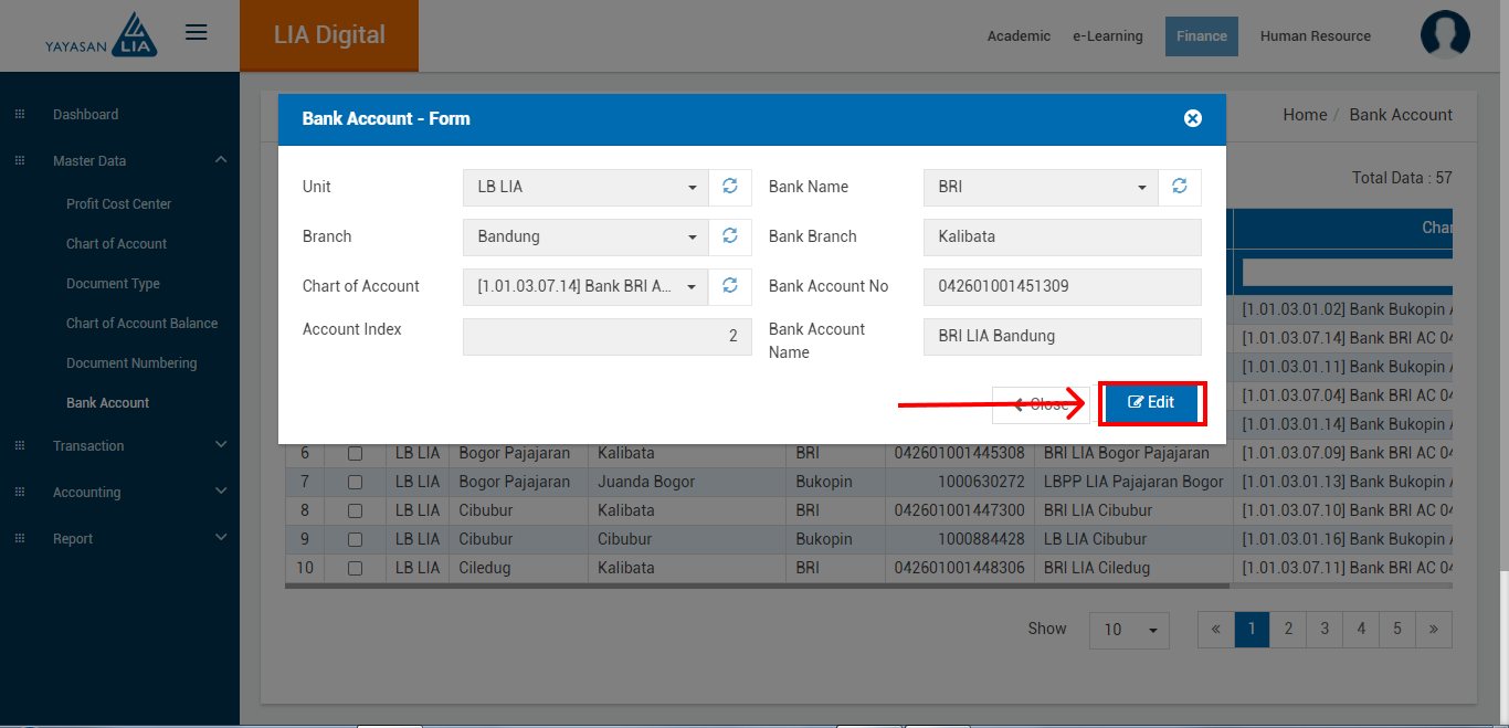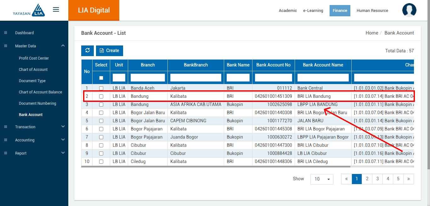 Bank Account menu yang berisi daftar akun bank keuangan.