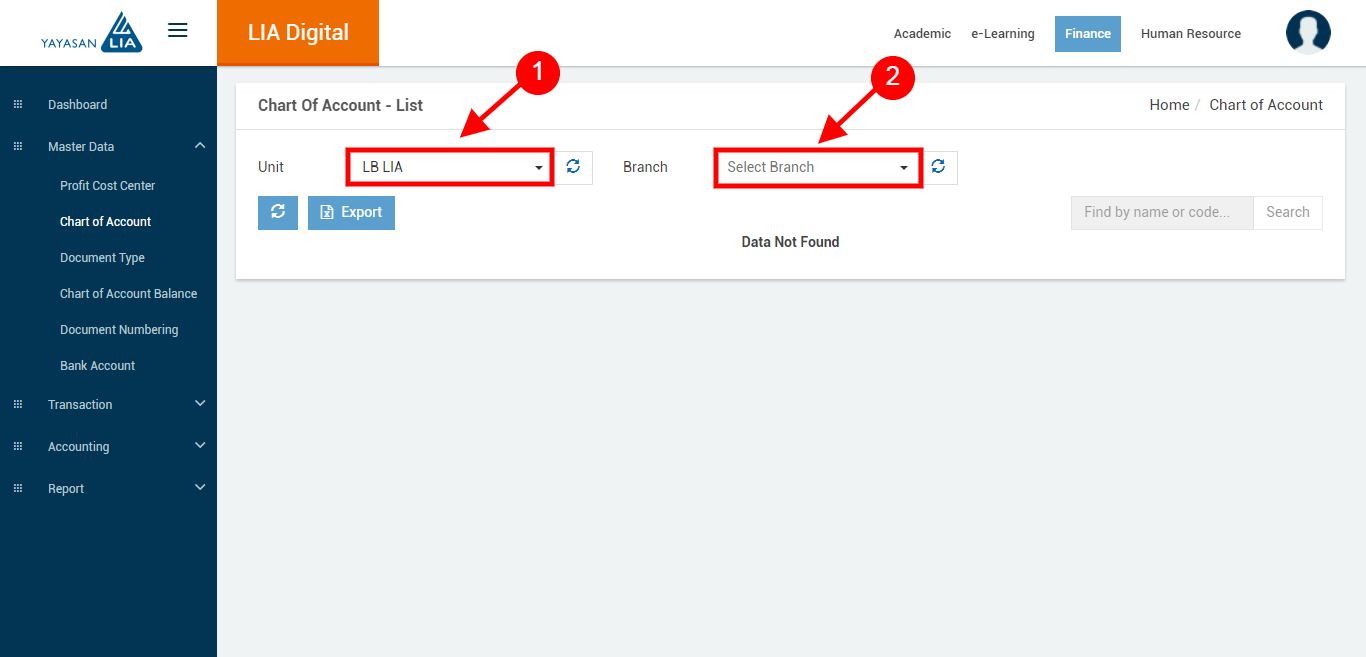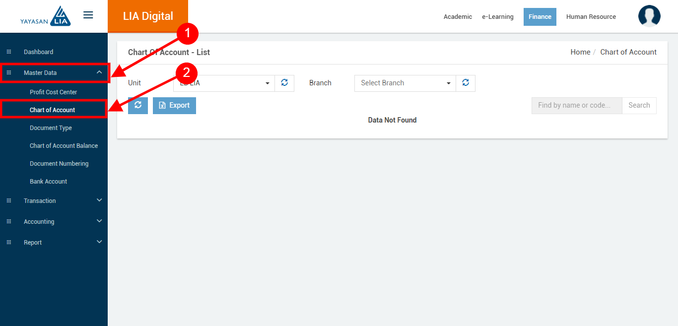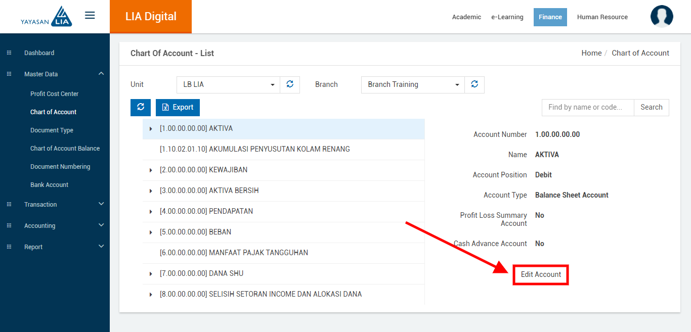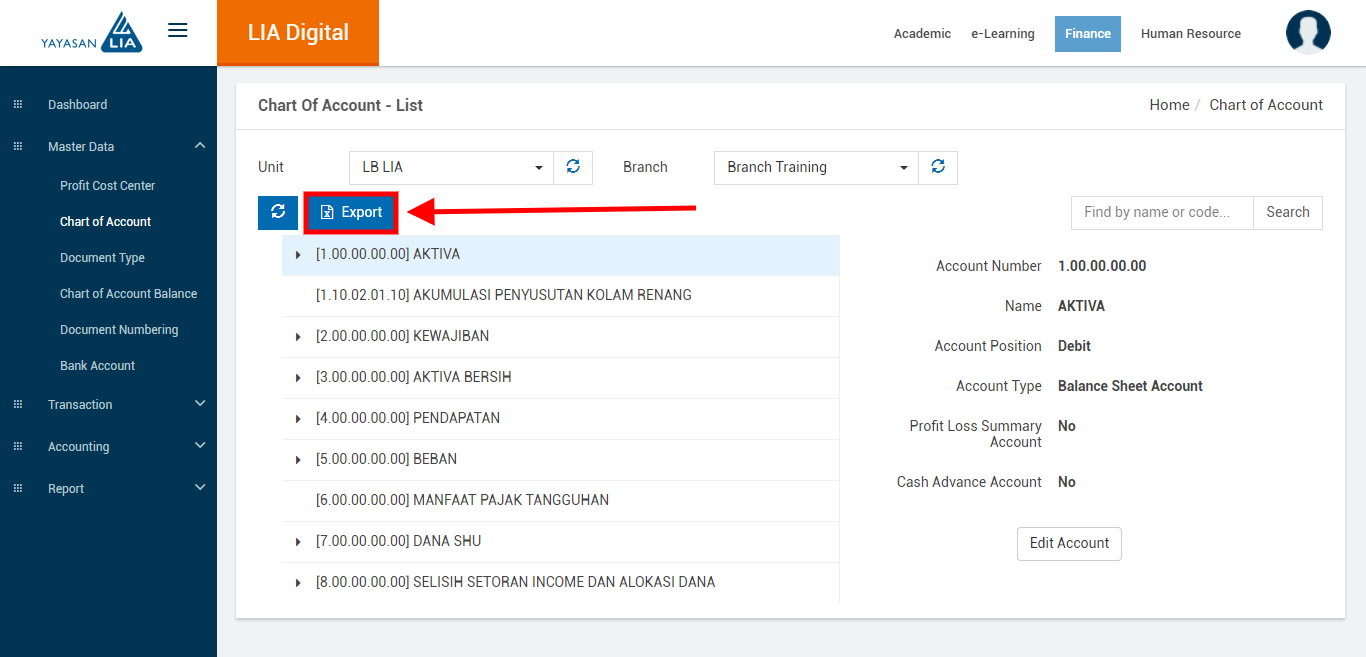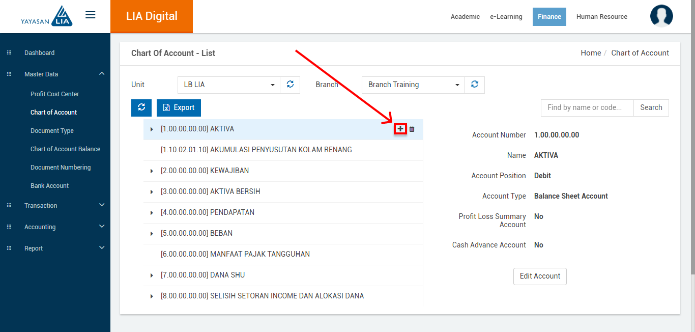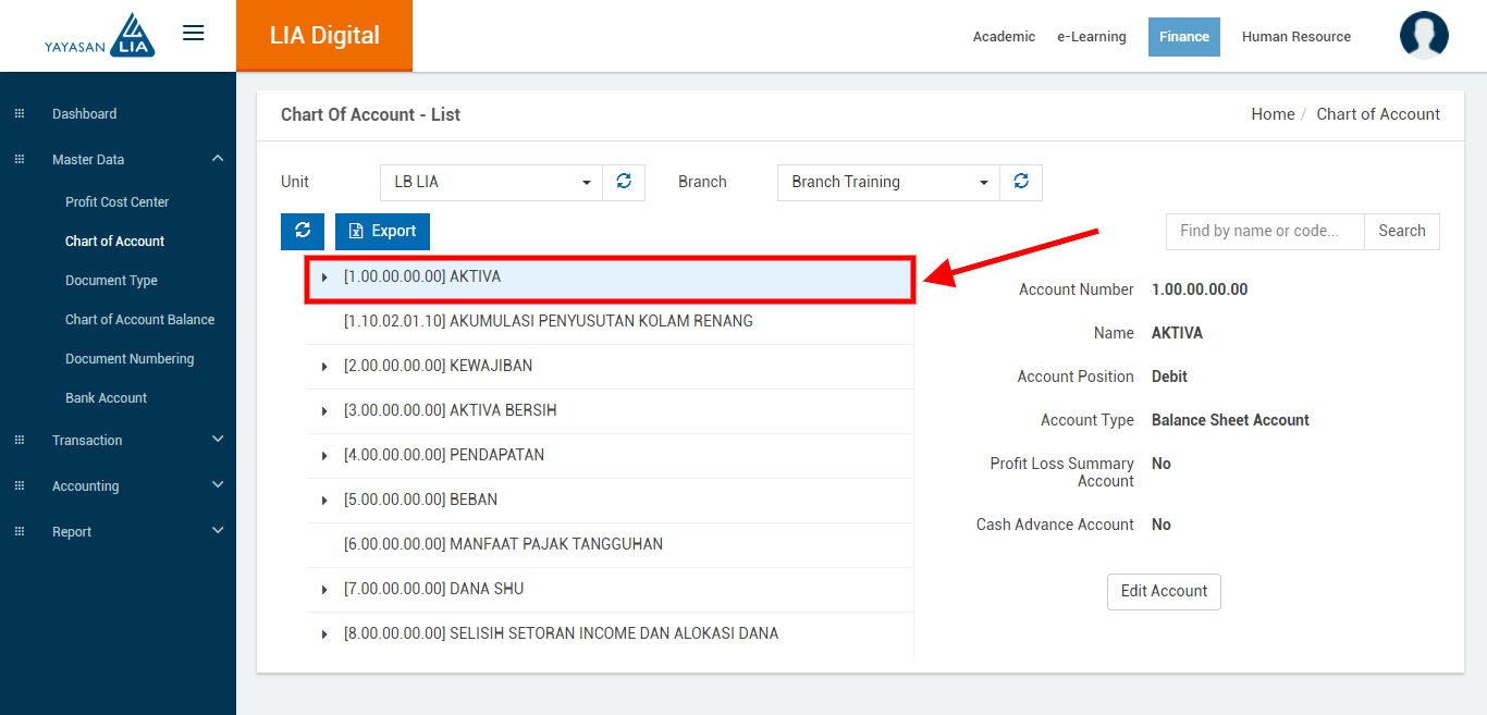 - Klik menu Master Data > Chart of Account pada sidebar dibagian kiri, maka akan tampil halaman diatas.