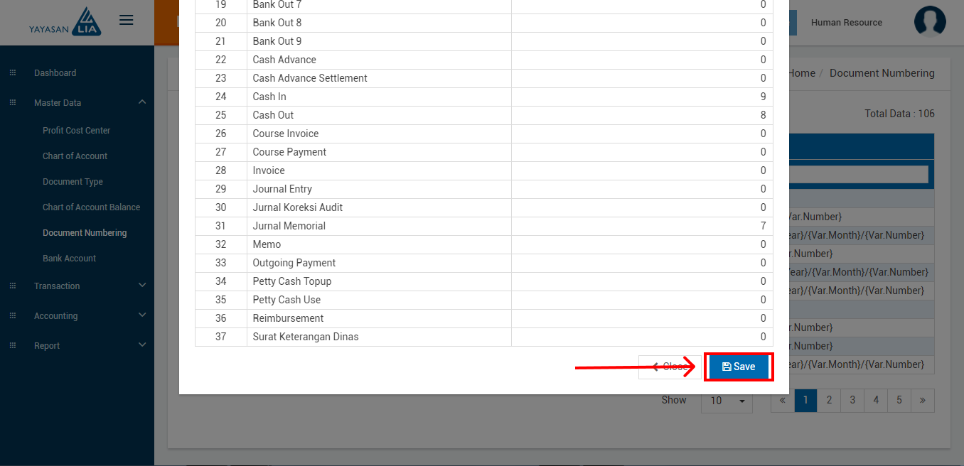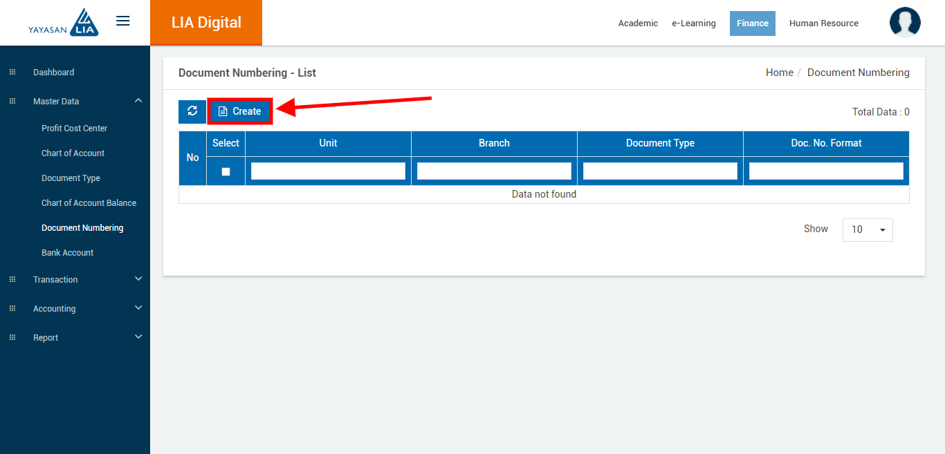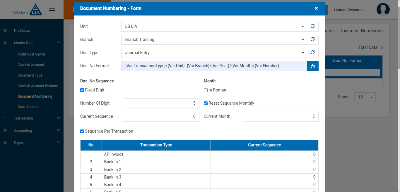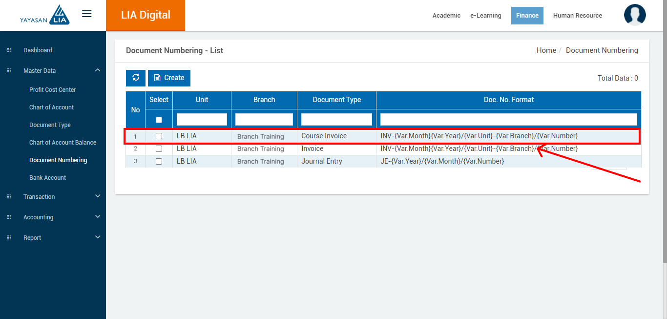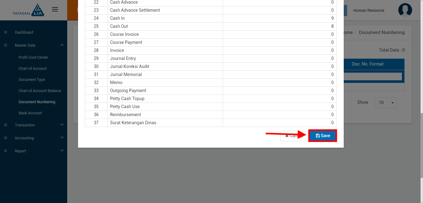 - Klik menu Master Data > Document Numbering pada sidebar dibagian kiri, maka akan tampil halaman diatas.