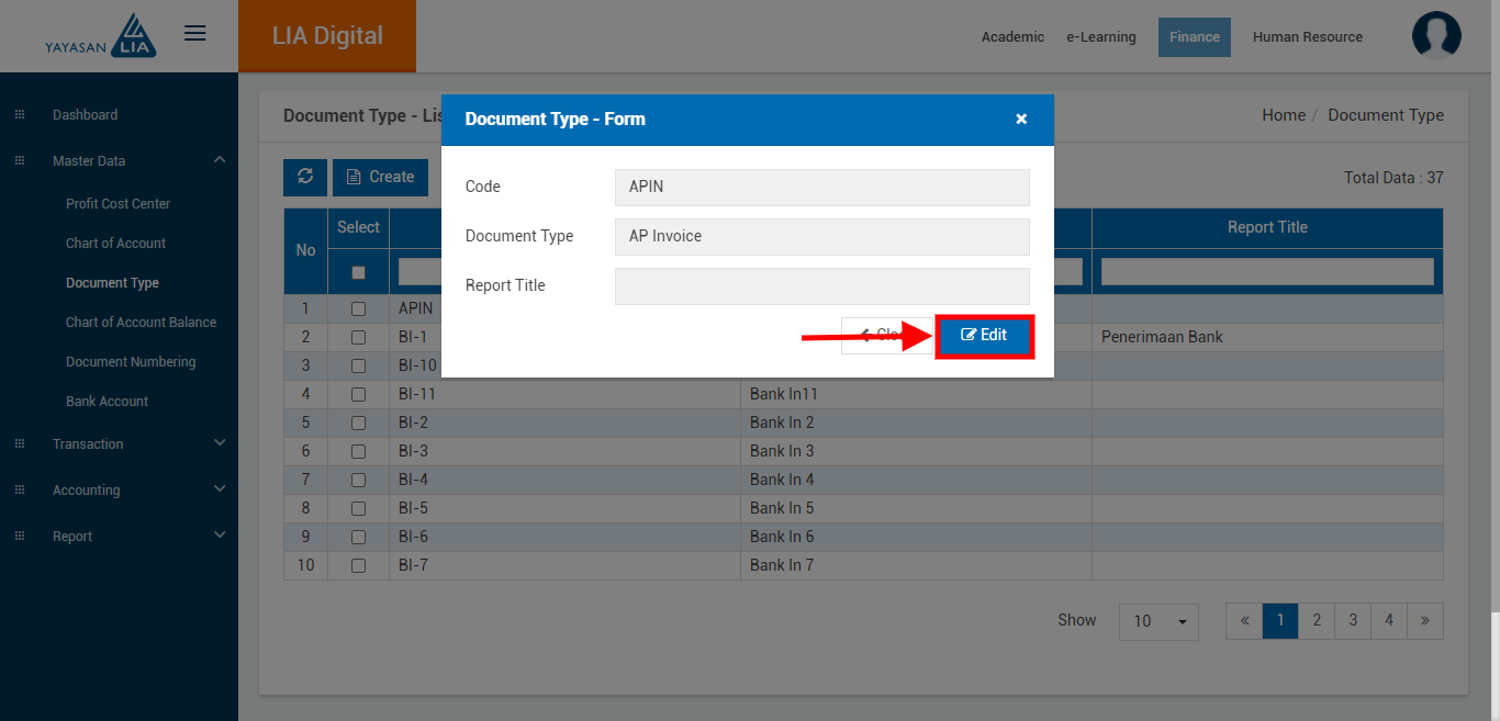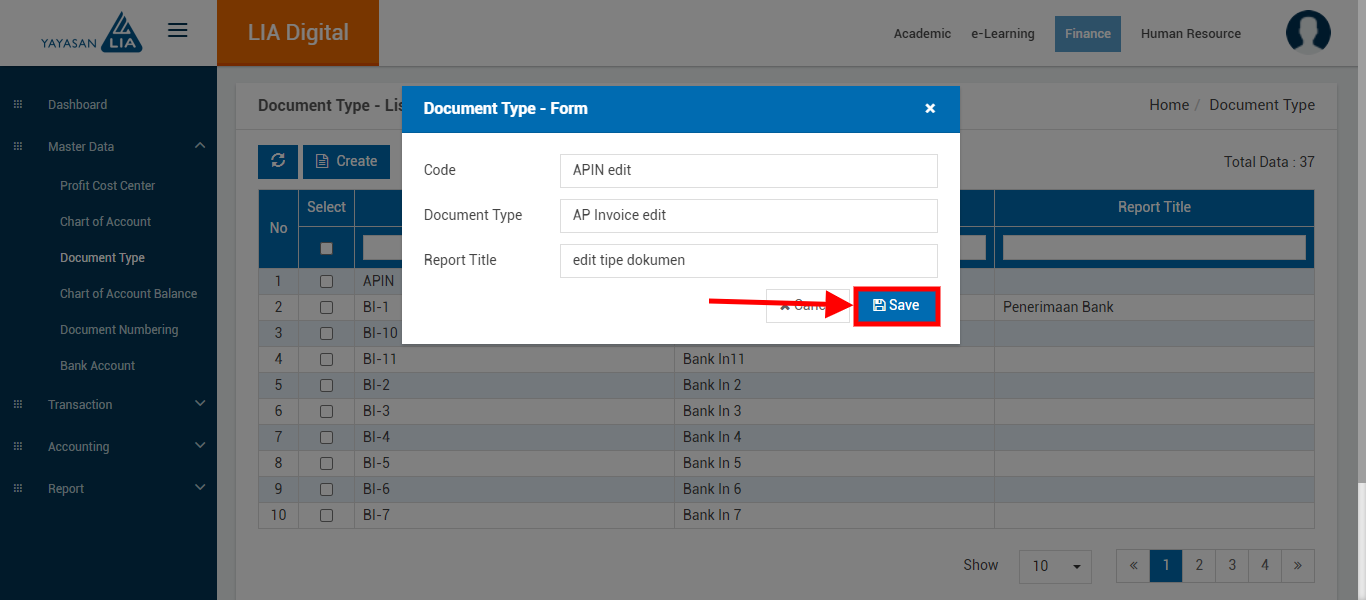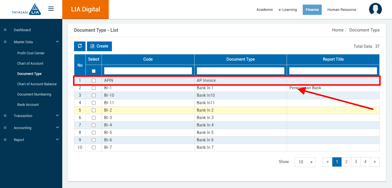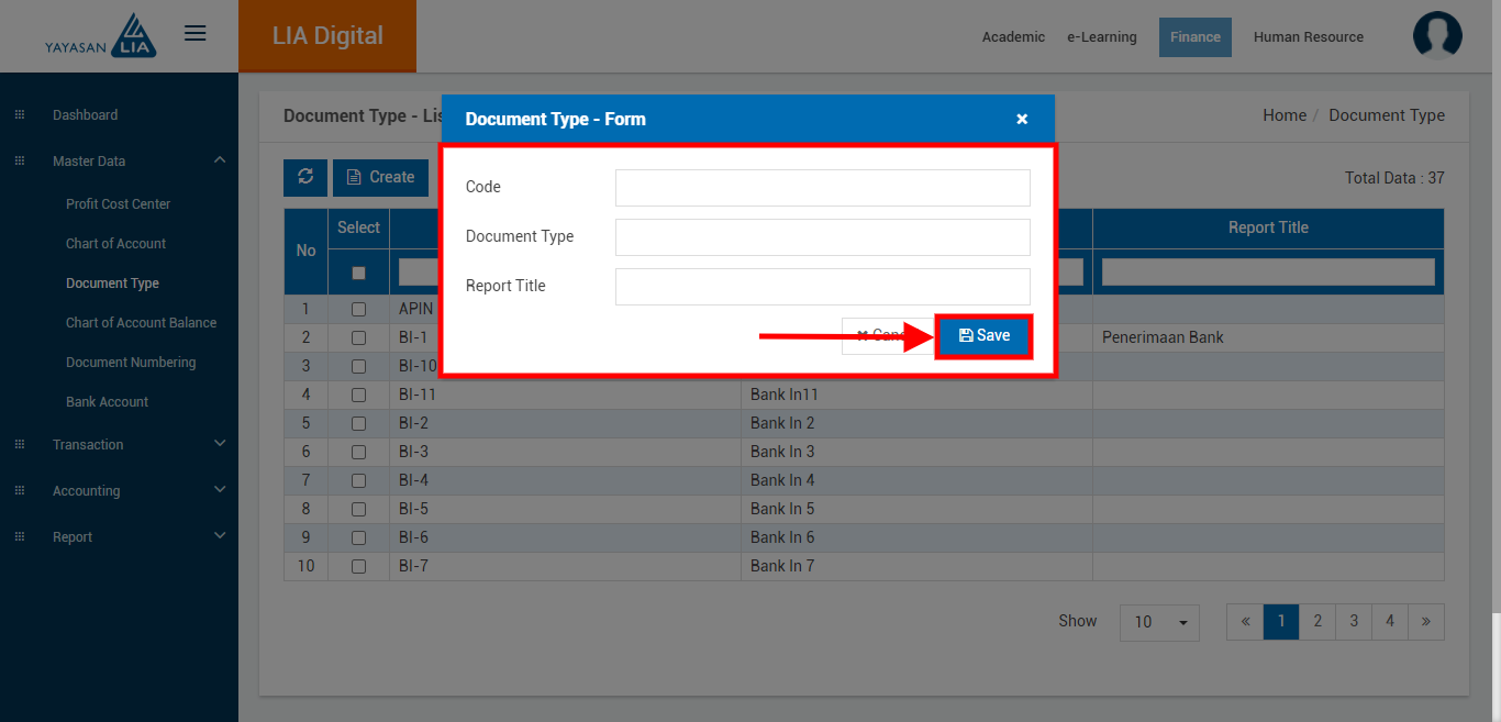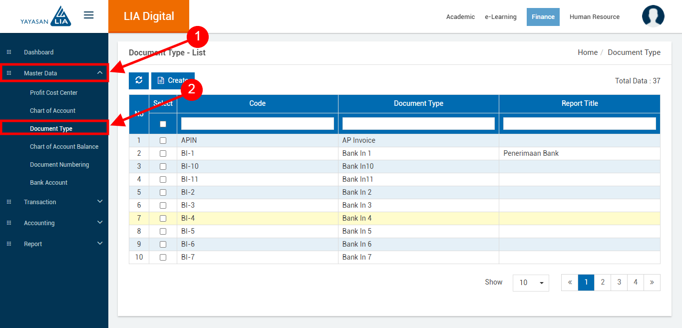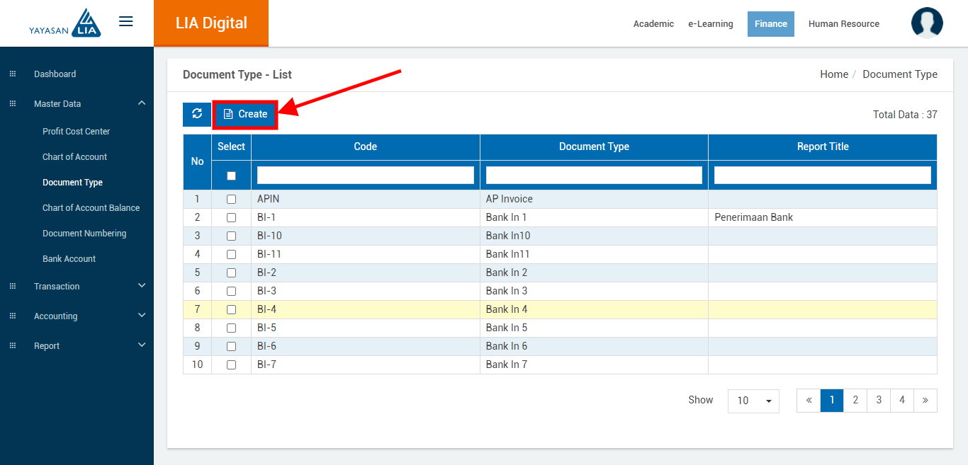 - Klik menu Master Data > Document Type pada sidebar dibagian kiri, maka akan tampil halaman diatas.