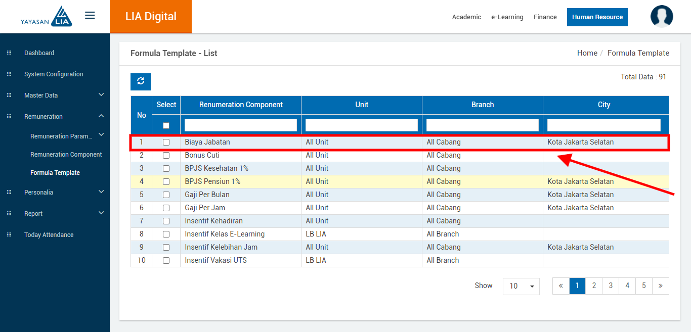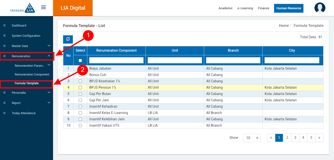 - Klik menu Remuneration > Formula Template pada sidebar dibagian kiri, maka akan tampil halaman diatas.