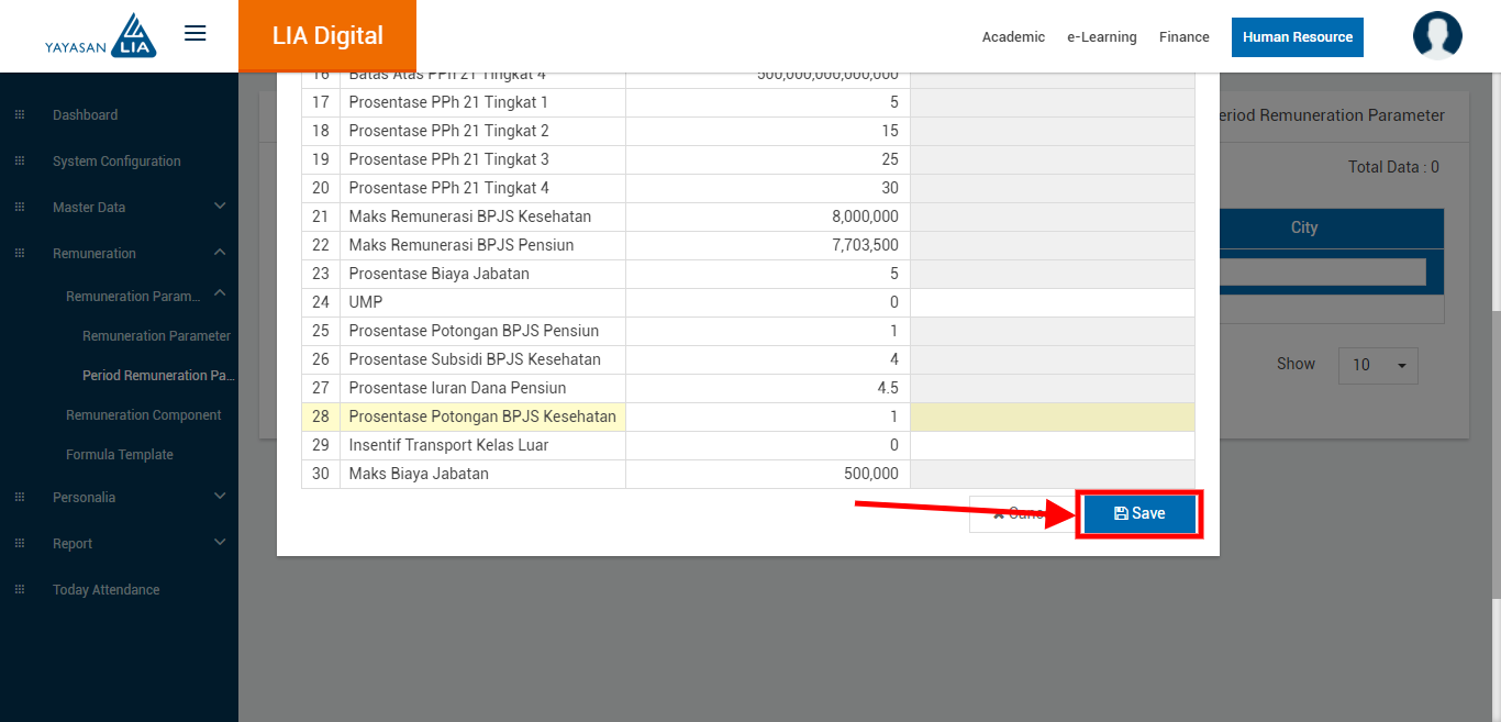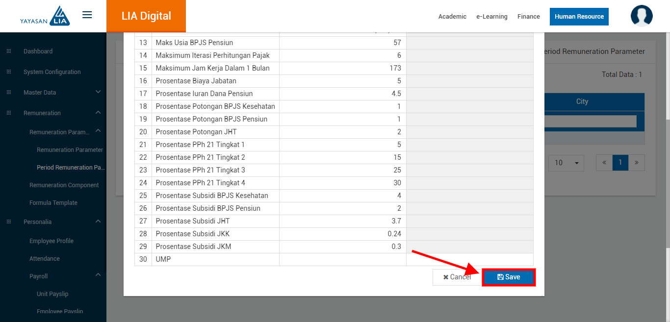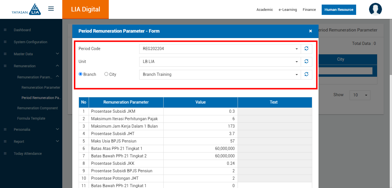 - Klik menu Master Data > Remuneration > Period Remuneration Parameter pada sidebar dibagian kiri, maka akan tampil halaman diatas.