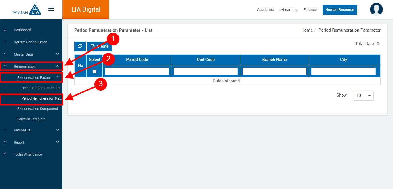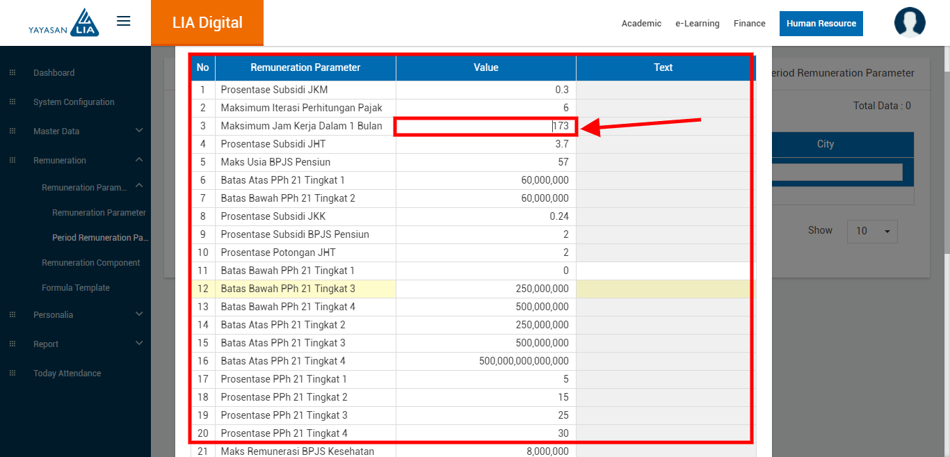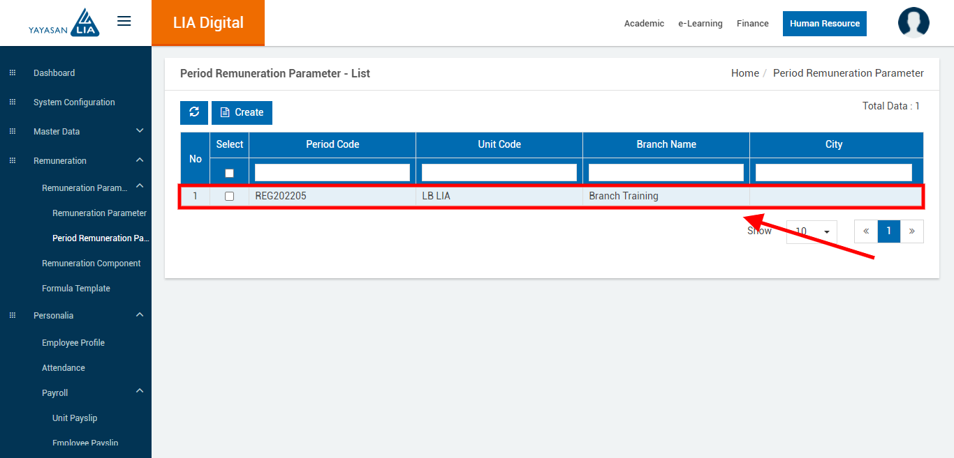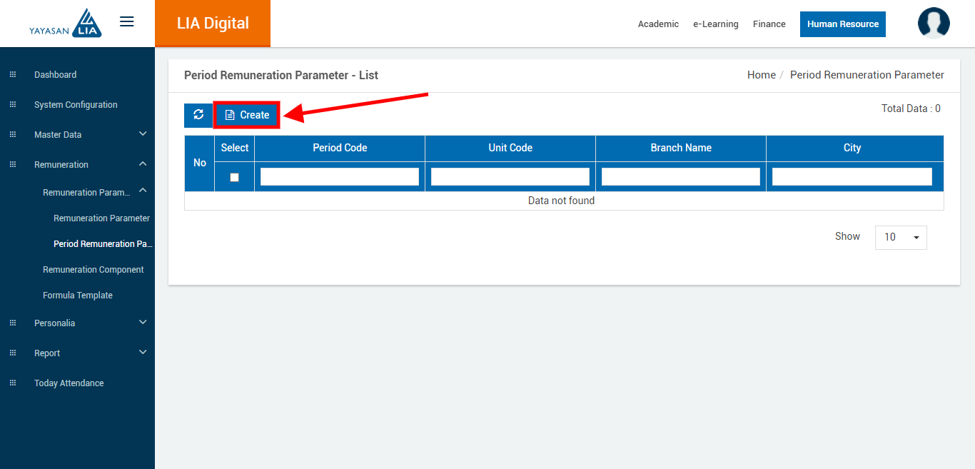 - Klik menu Master Data > Remuneration > Period Remuneration Parameter pada sidebar dibagian kiri, maka akan tampil halaman diatas.