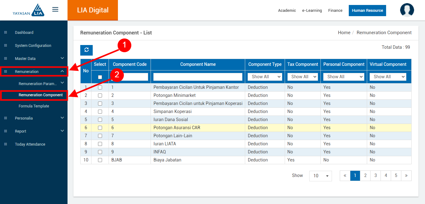 - Klik menu Remuneration > Remuneration Component pada sidebar dibagian kiri, maka akan tampil halaman diatas.