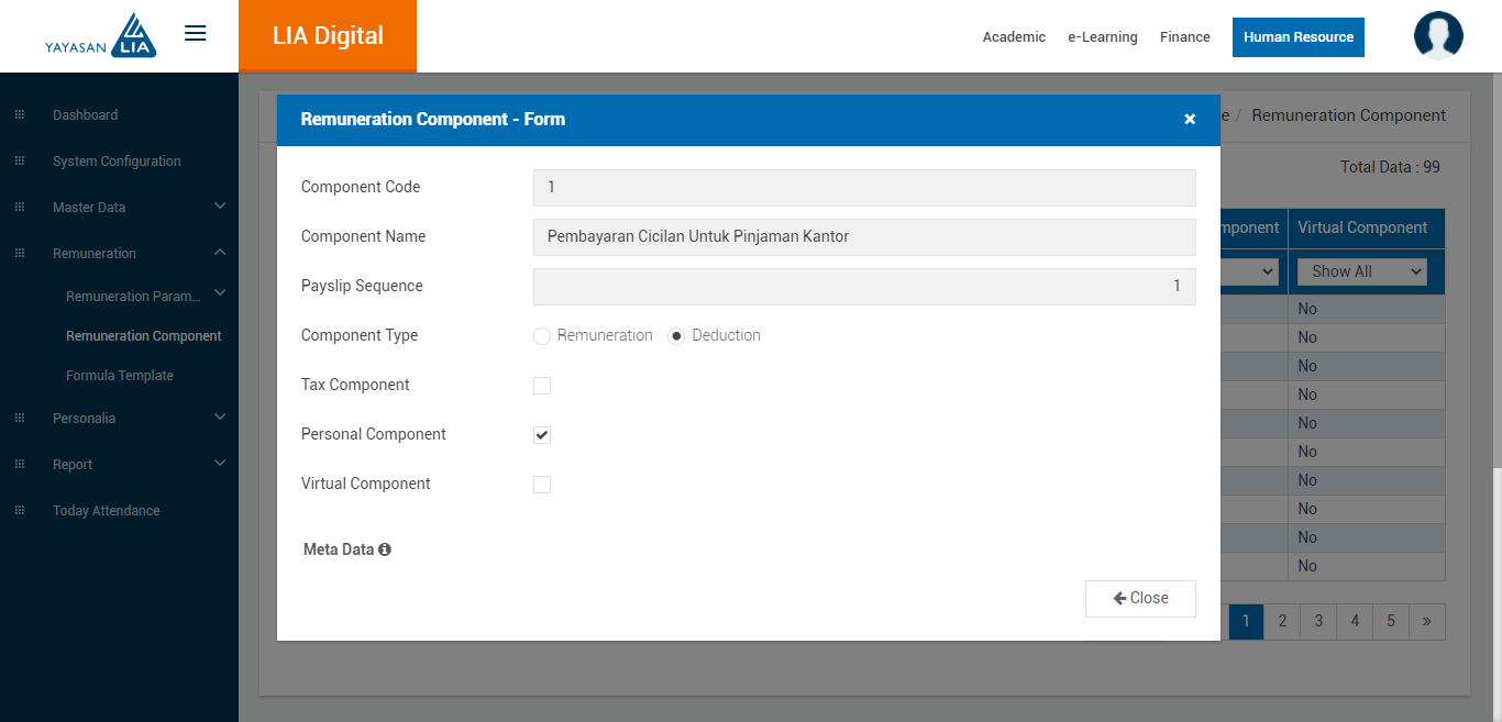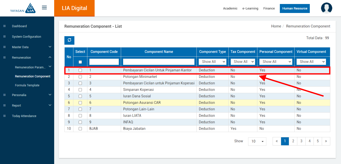 - Klik data Remuneration Component untuk melihat lebih detail.