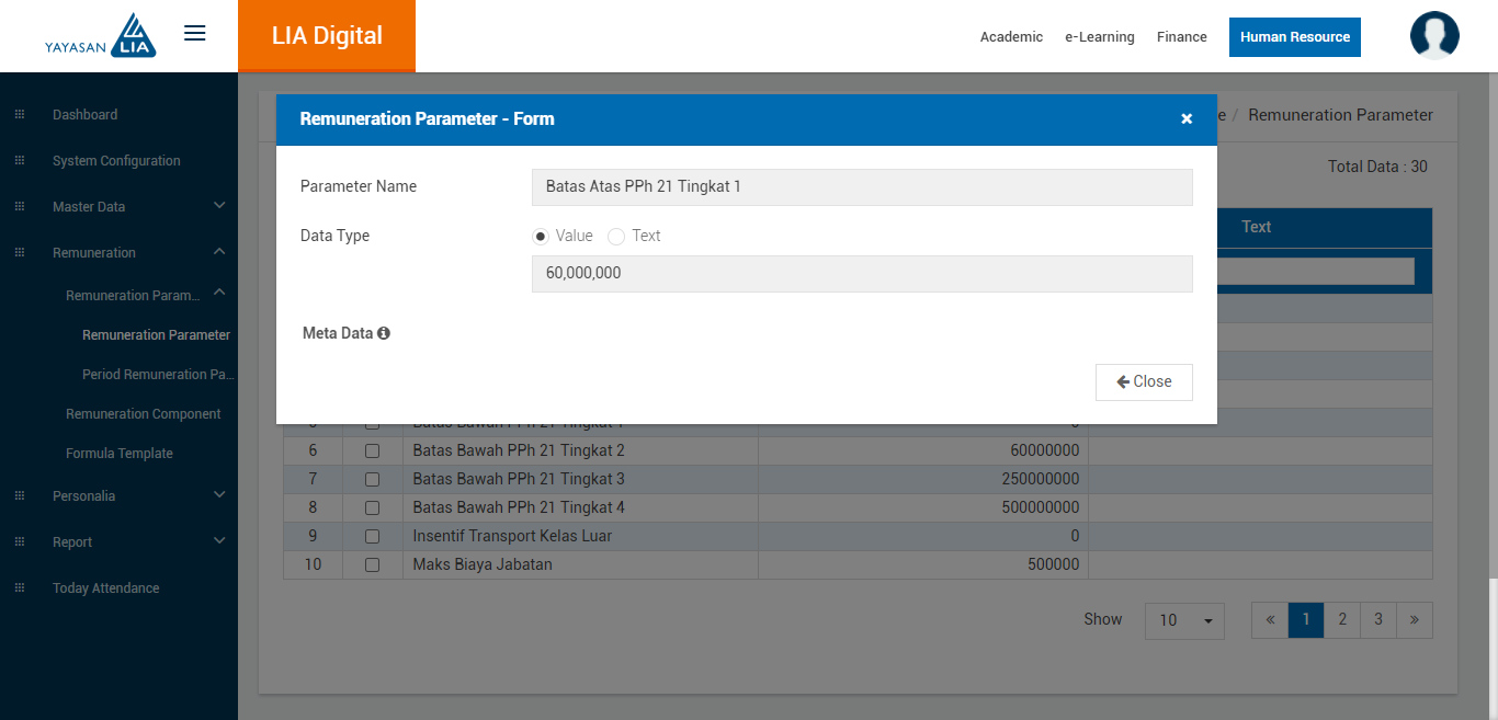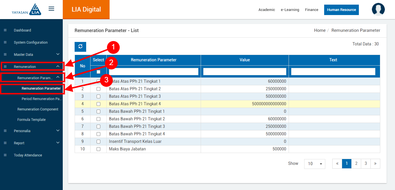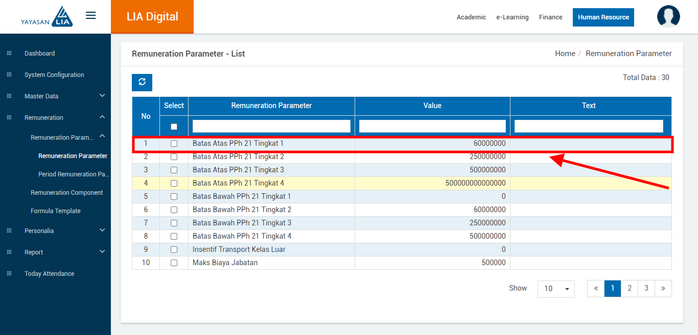 - Klik menu Remuneration > Remuneration Parameter > Remuneration Parameter pada sidebar dibagian kiri, maka akan tampil halaman diatas.