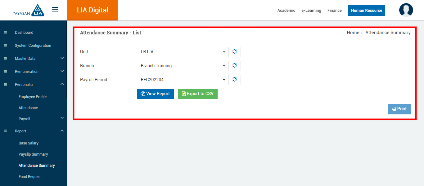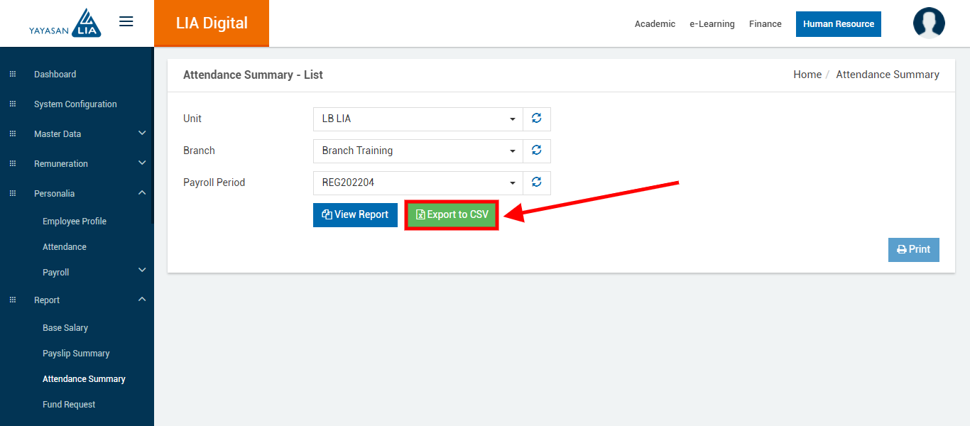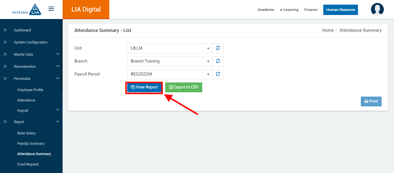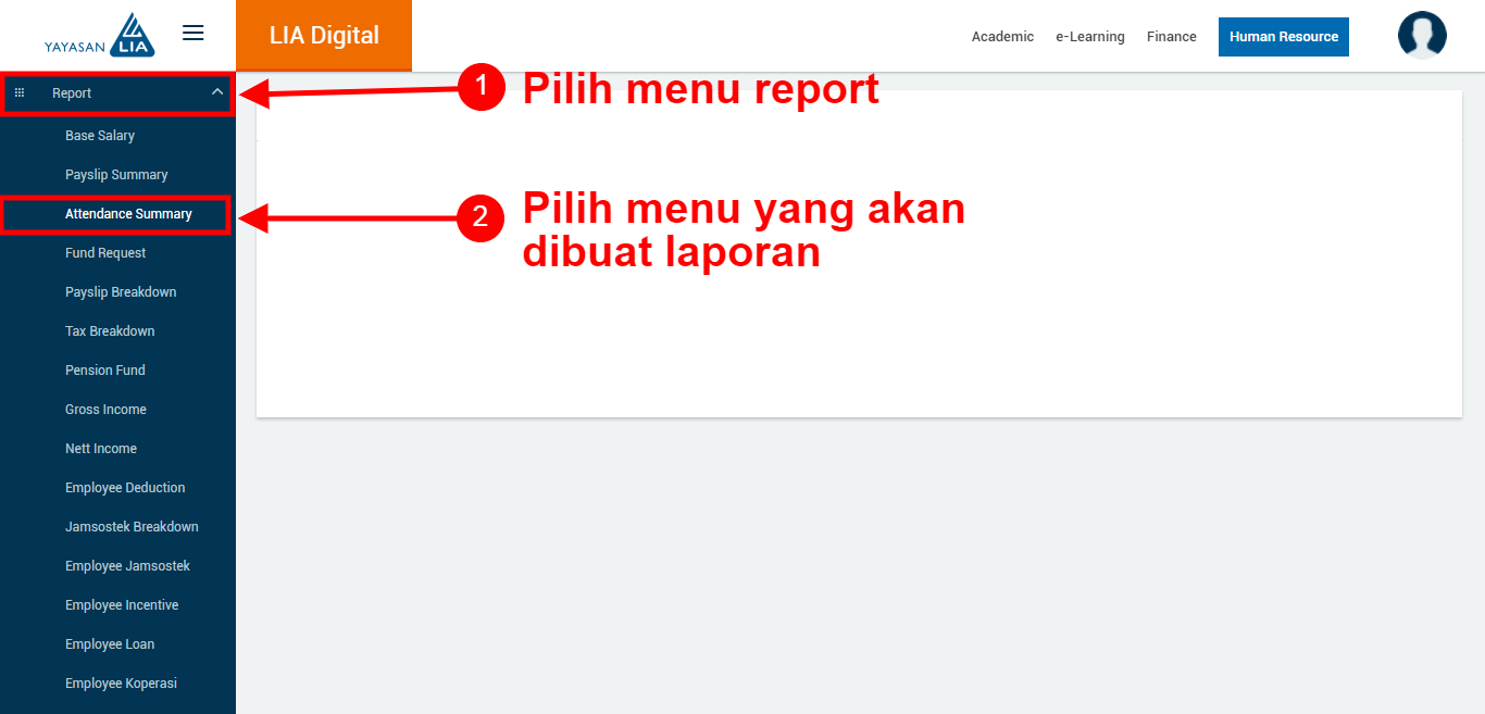 - Klik menu Report > pilih menu yang akan dibuat laporan (contoh : Report > Attendance Summary)
